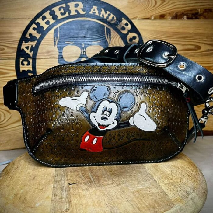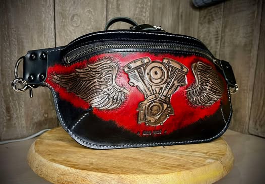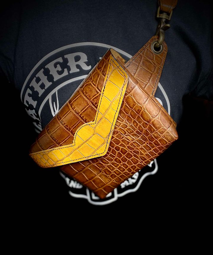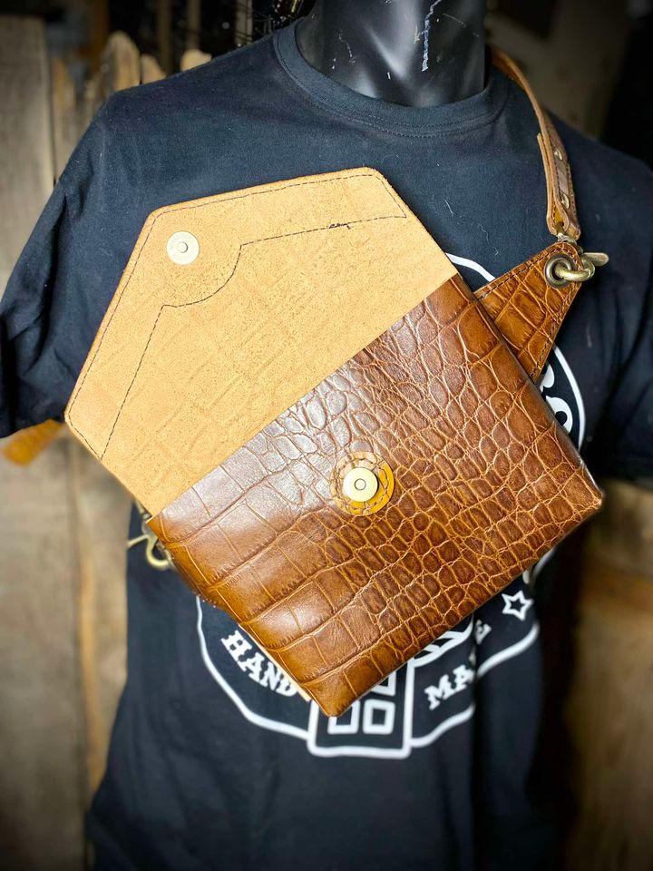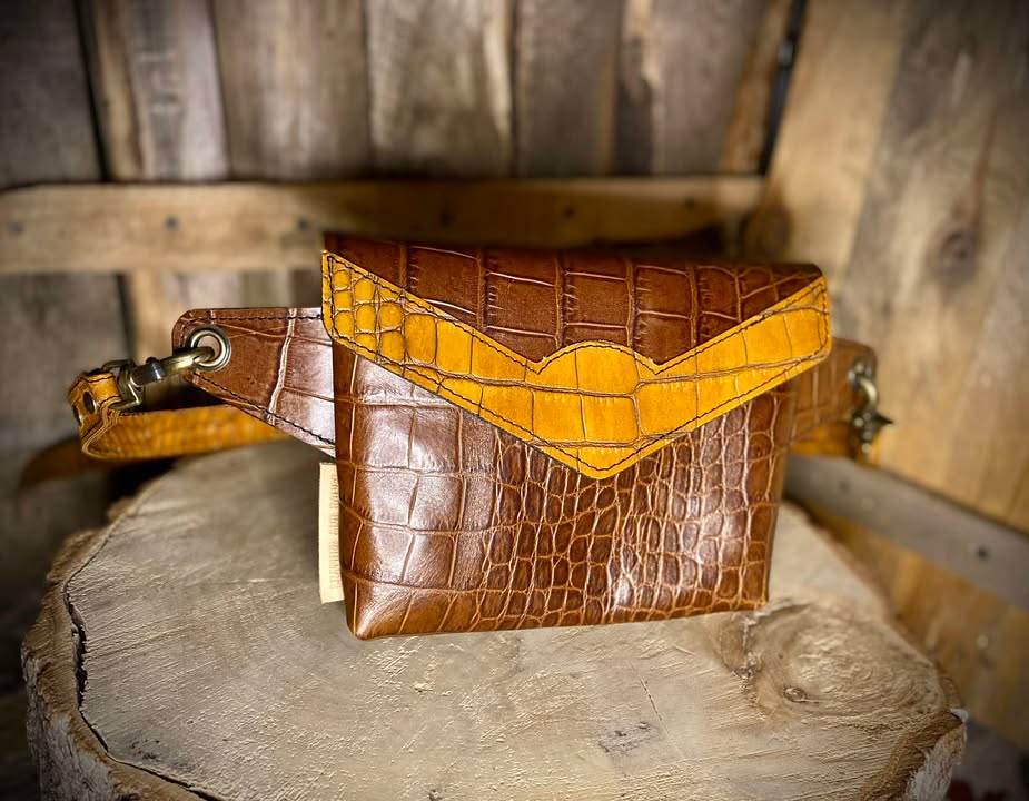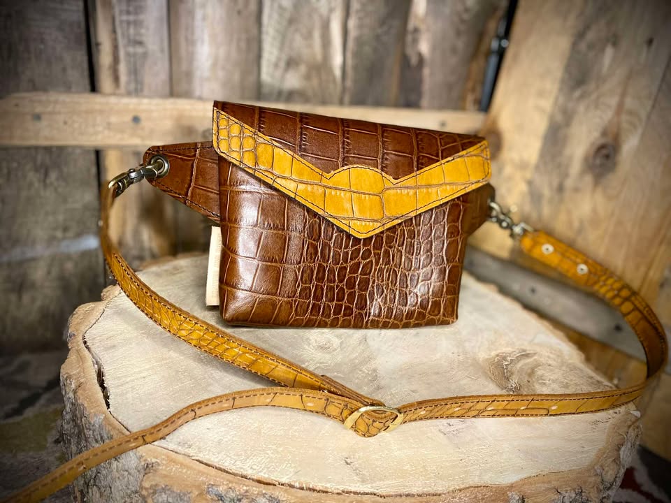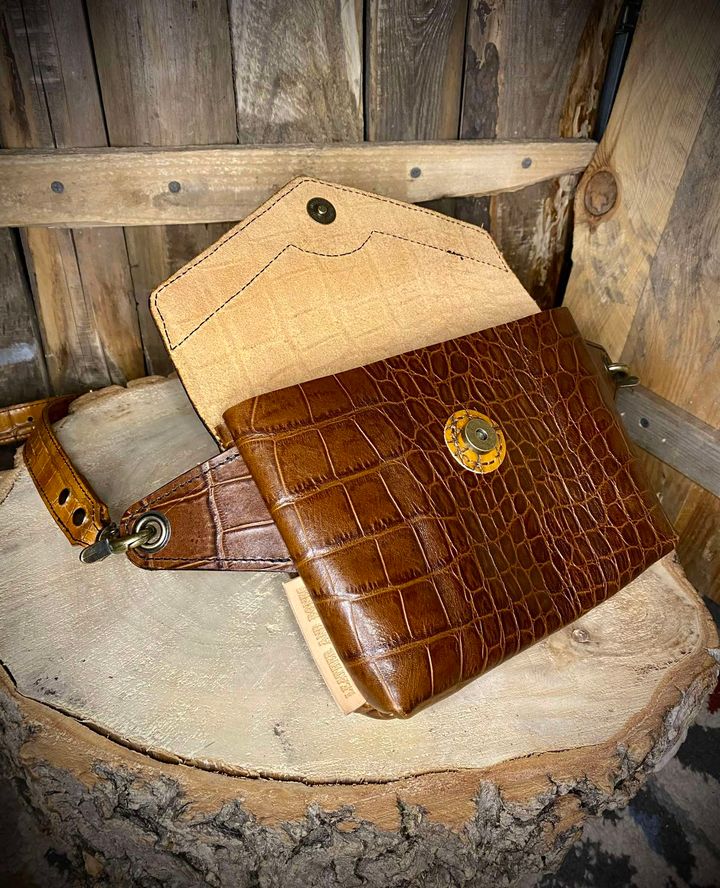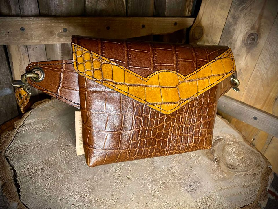 Torebka skórzana, nerka z paskiem, wykonana ze skóry bydlęcej tłoczonej na krokodyla.