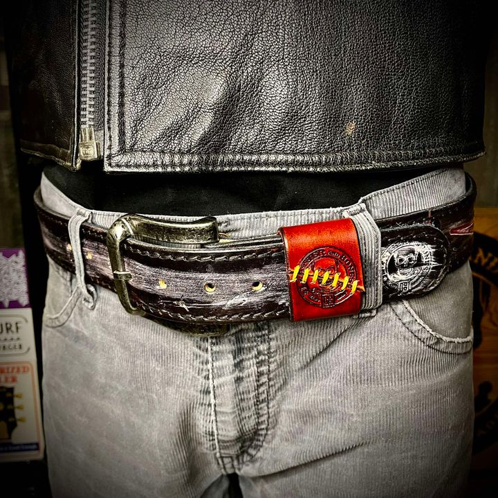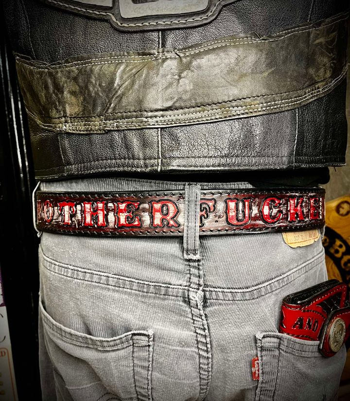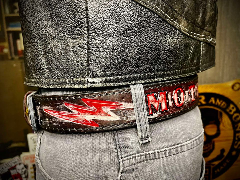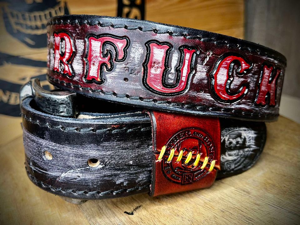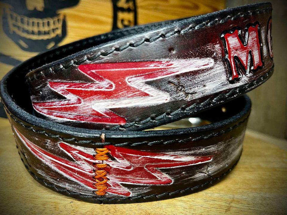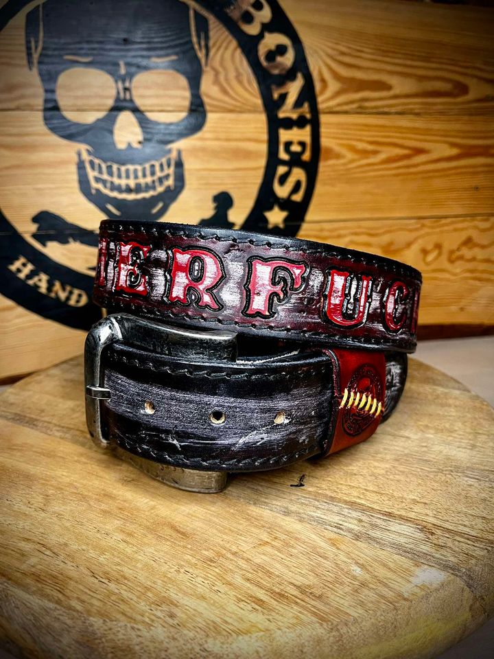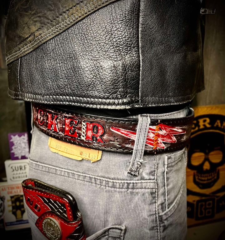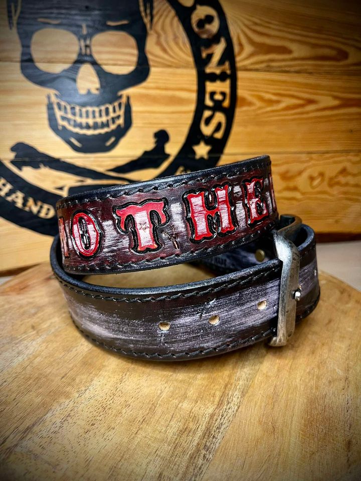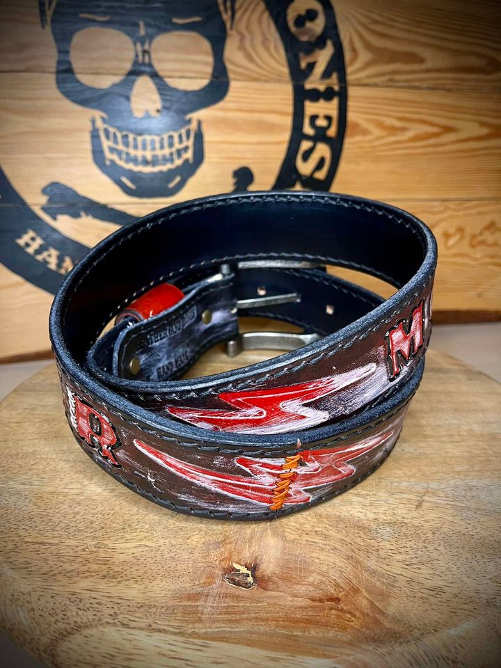 Pasek wykonany ze skóry bydlęcej grubości 5 mm , ręcznie tłoczony i farbowany.