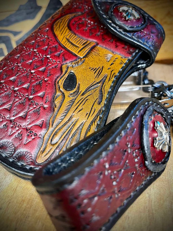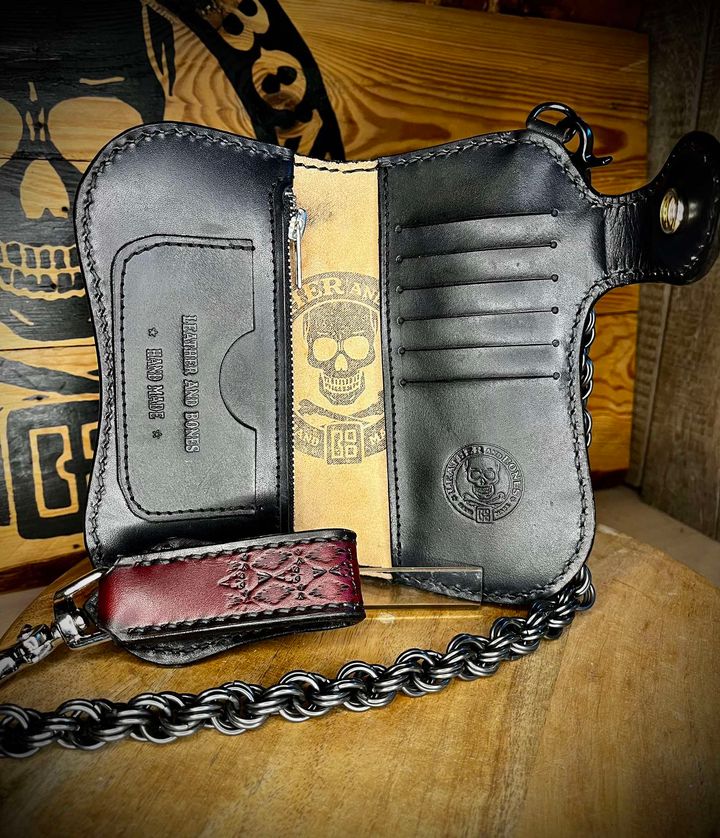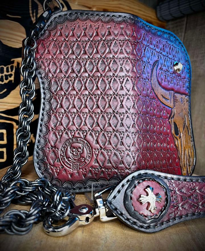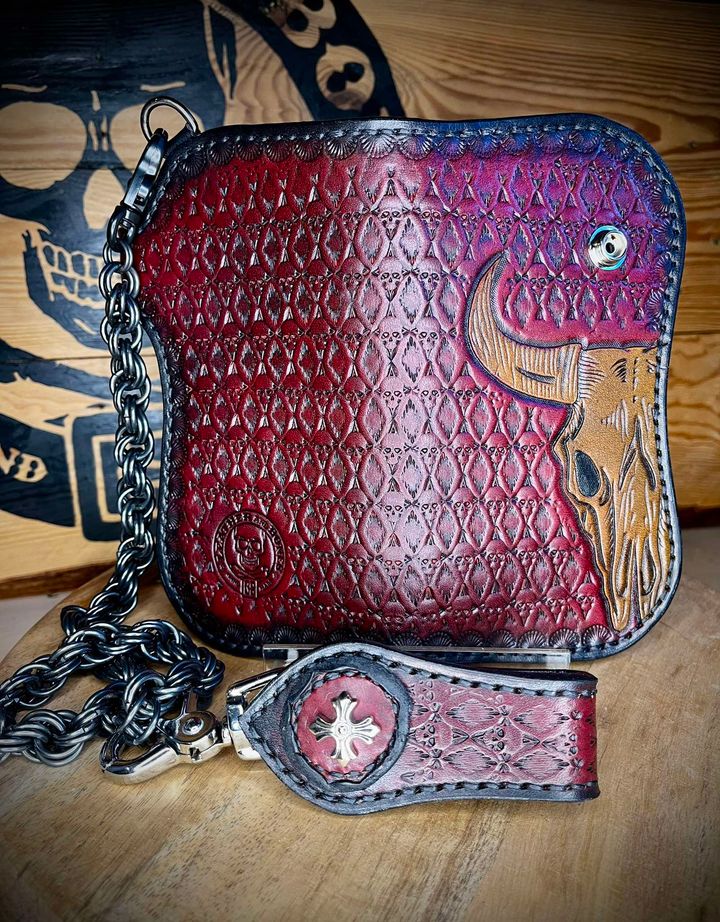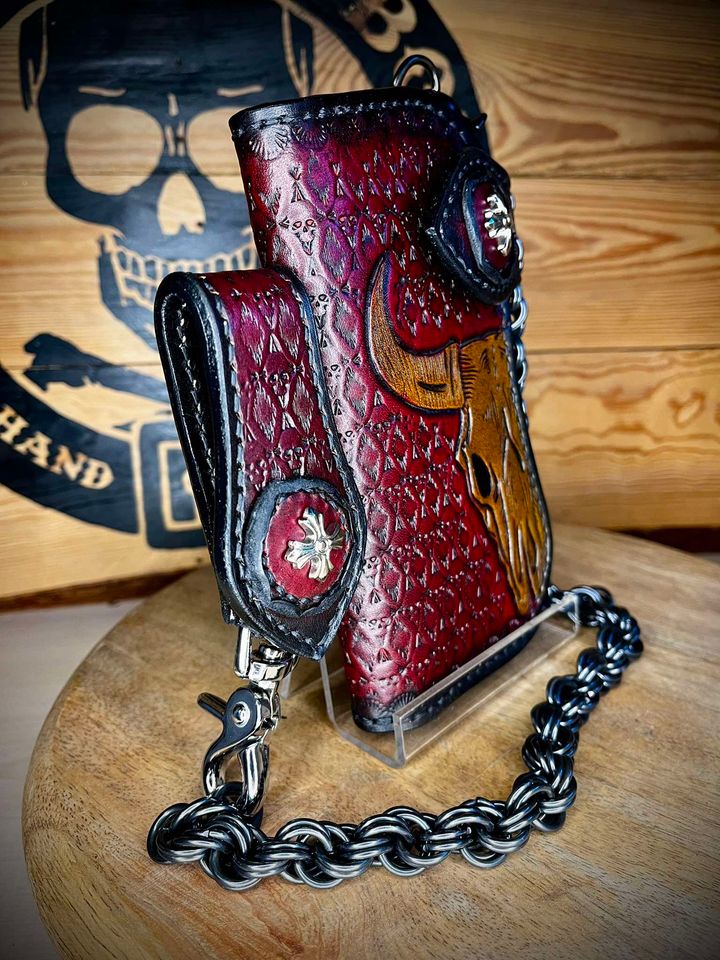 Portfel wykonany ze skóry bydlęcej, ręcznie szyty i tłoczony.