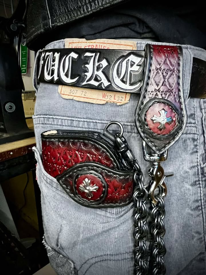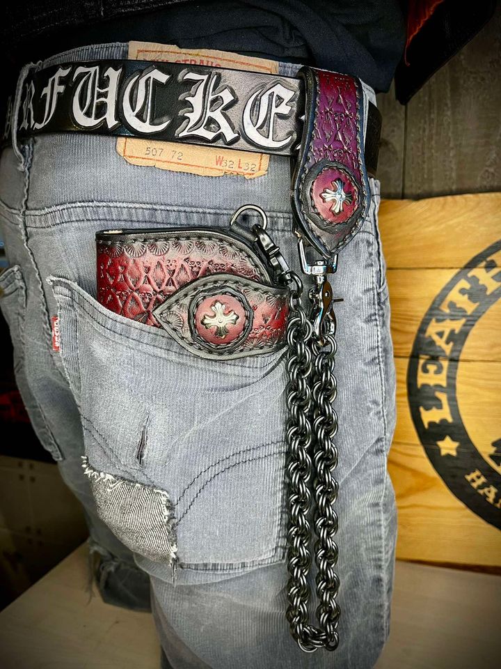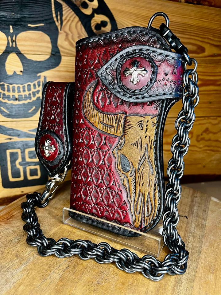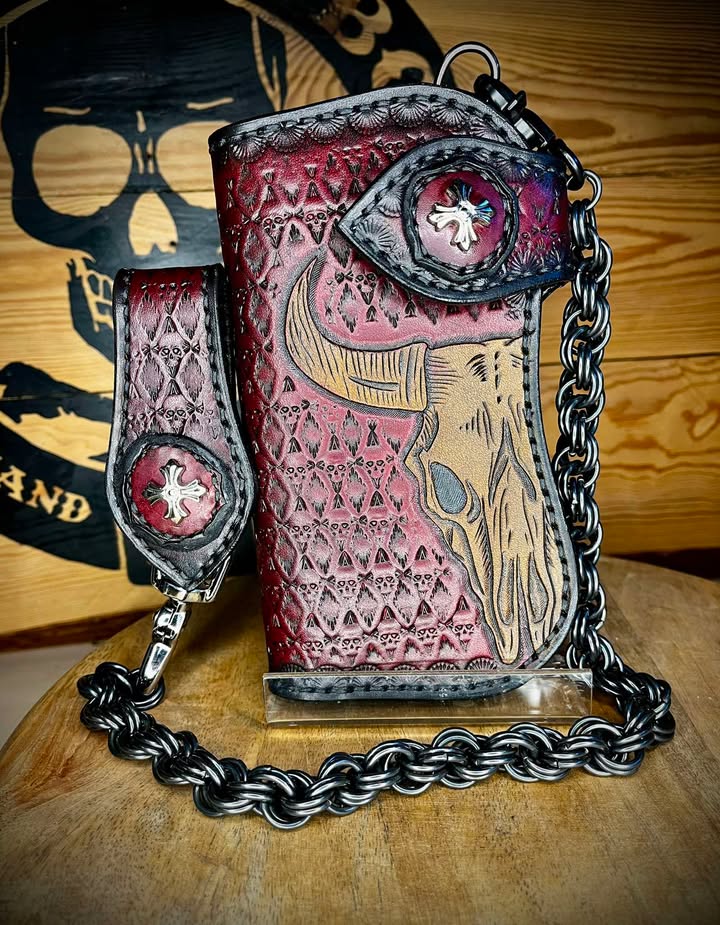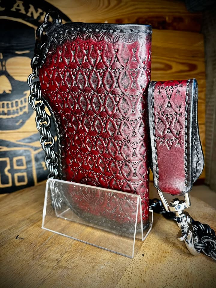 Portfel wykonany ze skóry bydlęcej, ręcznie szyty i tłoczony.